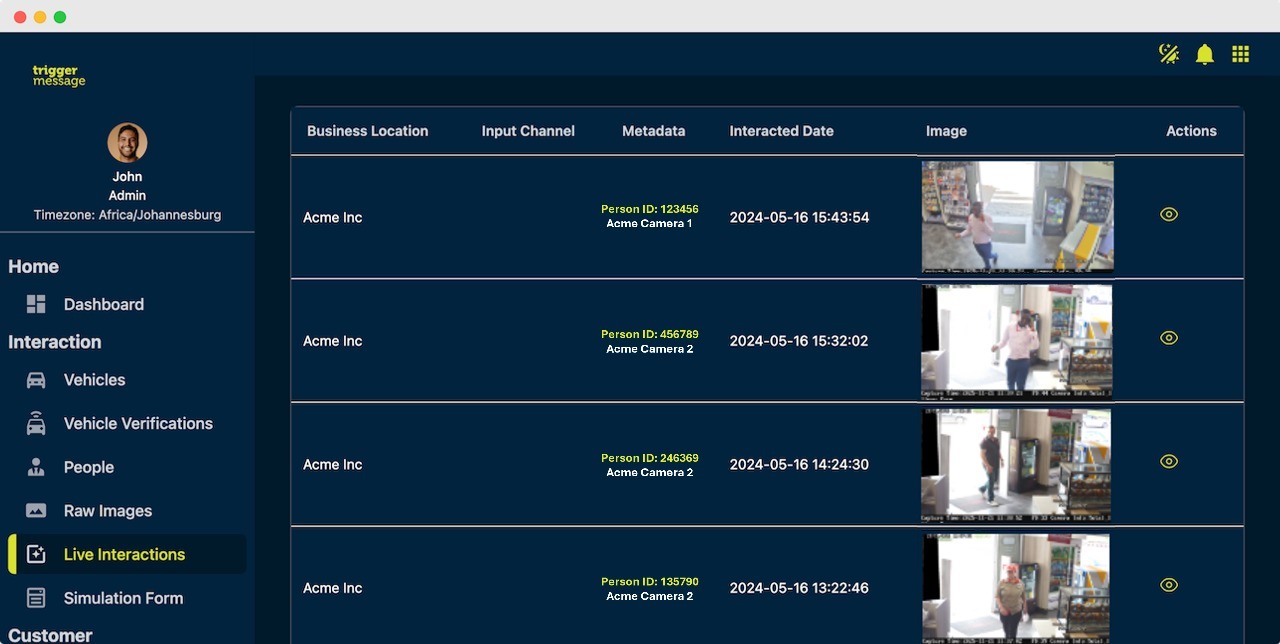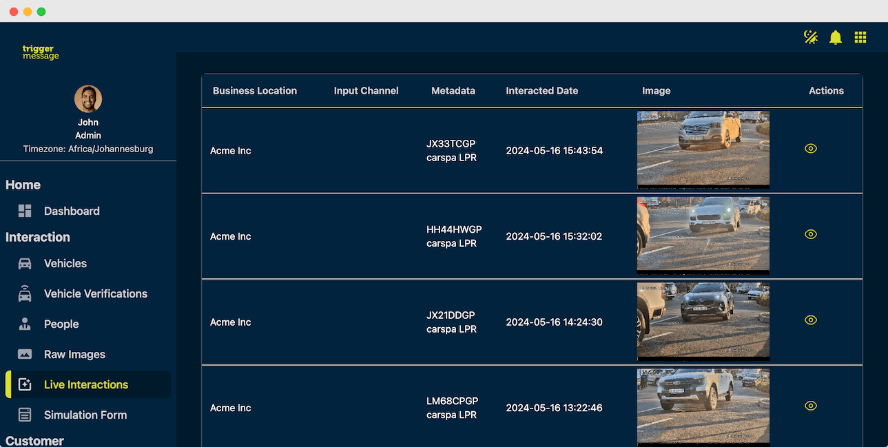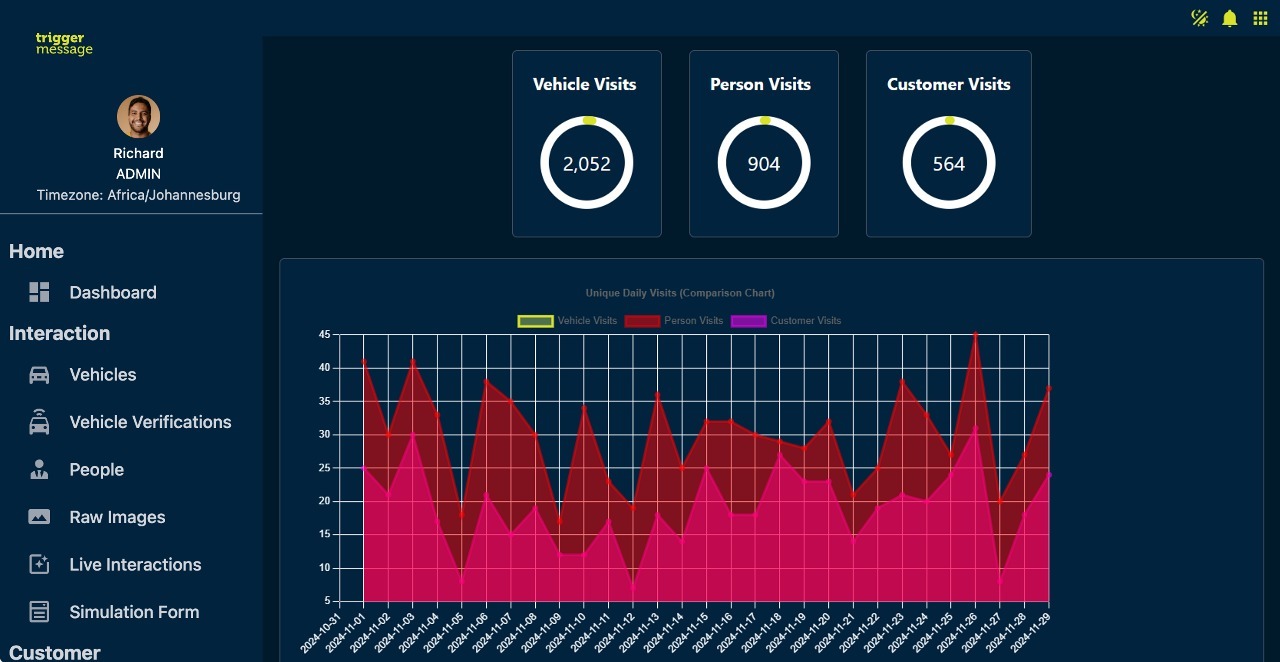 Trigger Message pairs with LPR and facial recognition cameras to recognise vehicles and faces in real time, triggers the right actions on WhatsApp/ Email/ Telegram, and shows you the impact across one or many sites.